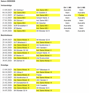 Mit zwei neuen Spitzenbrettern trat die dritte Mannschaft an. Am Ende stand gegen die Zweitvertretung der Billerbecker zwar ein Remis (12:12) – aber die erste Runde dürfte Selbstvertrauen gegeben haben. Mal sehen, wie die kommenden Runden verlaufen. Personell ist man sehr gut aufgestellt. Knapp hinter den beiden Aufstiegsplätzen aus Platz 3 der Tabelle.