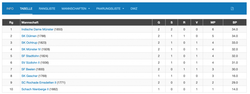 Unsere erste Mannschaft schlug sich auch ohne ihr neues erstes Brett sehr gut und konnte die Gastgeber des SK Ochtrup knapp, aber durchaus verdient mit 17:15 (neue Wertung) in die Schranken weisen. Macht drei Mannschaftspunkte und wichtige Brettpunkte. Aktuell Platz Vier in der Tabelle.